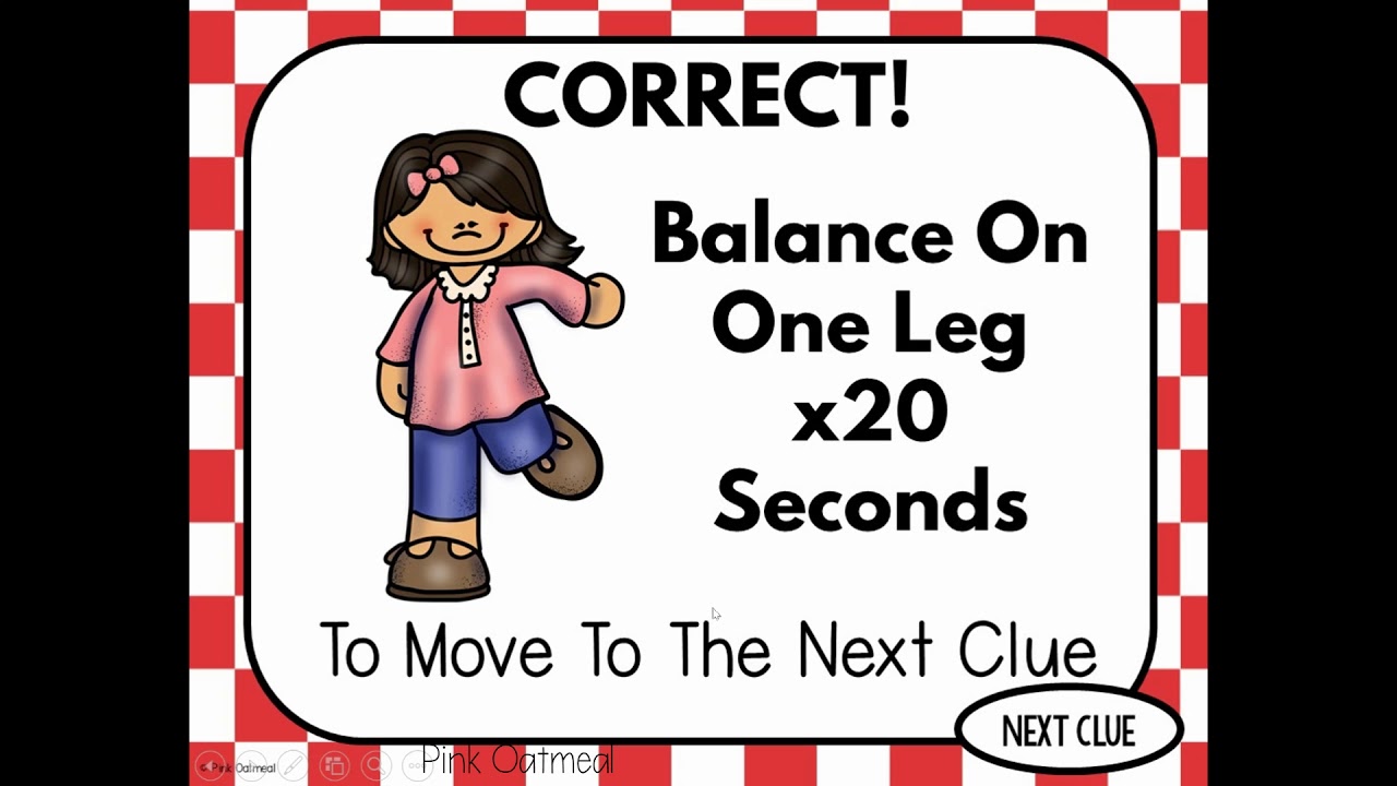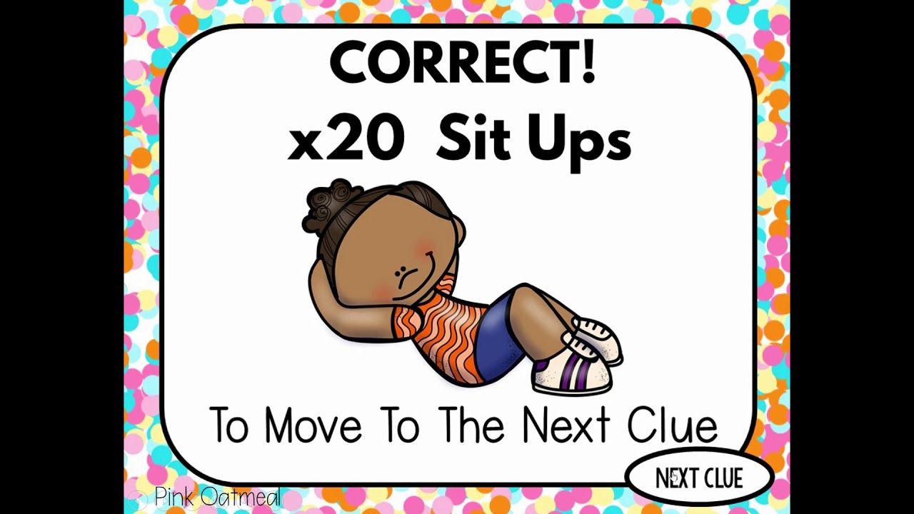 There are 10 different “rooms” for each game.ย There is a problem to solve to get the code.ย When the correct code is unlocked the fitness activity appears.ย Once the fitness activity has been performed the kids can move to the next room and clue.ย Fun sound effects are included to make the game even more fun!